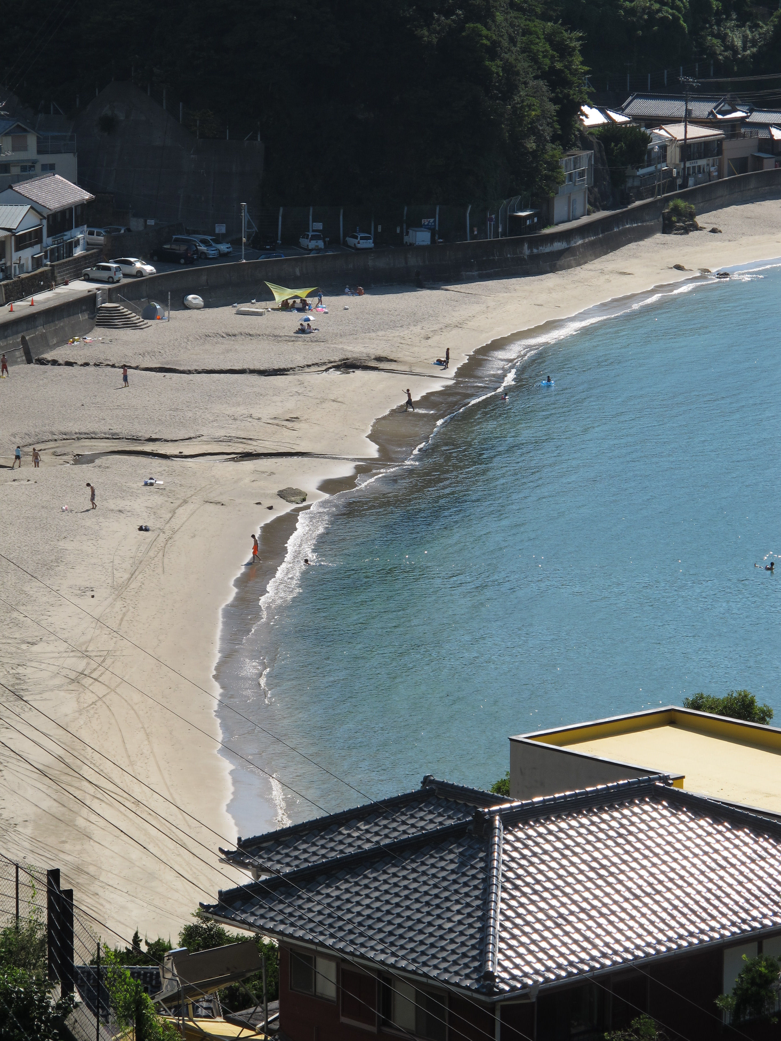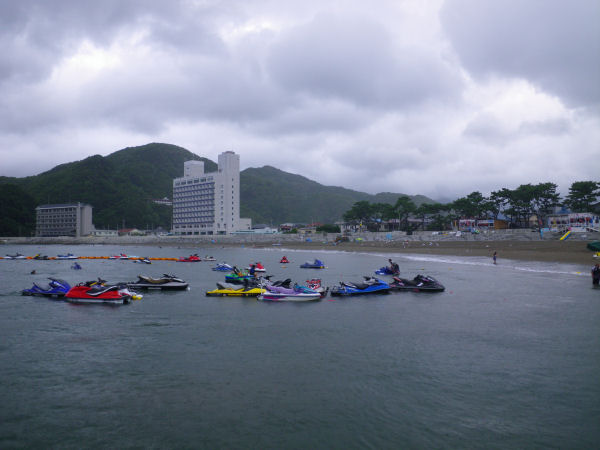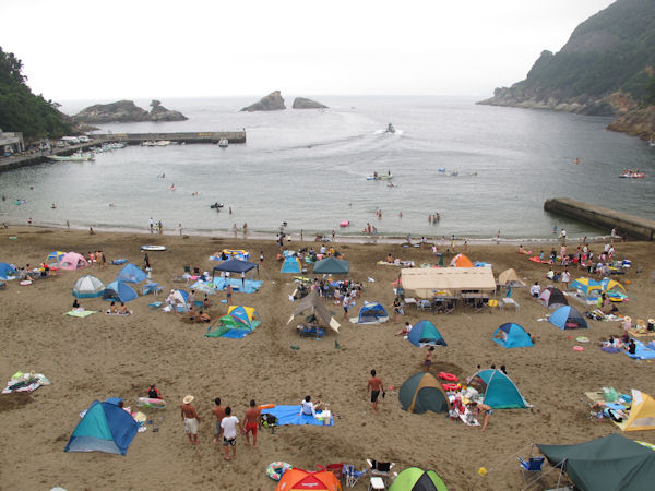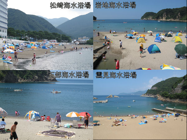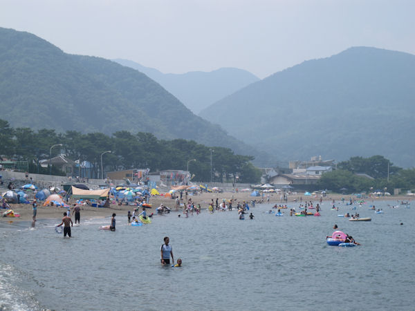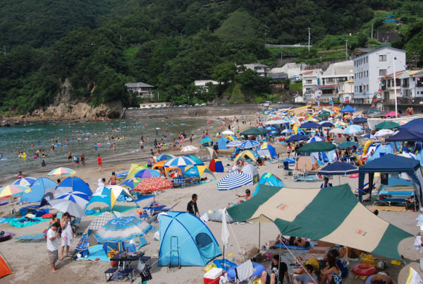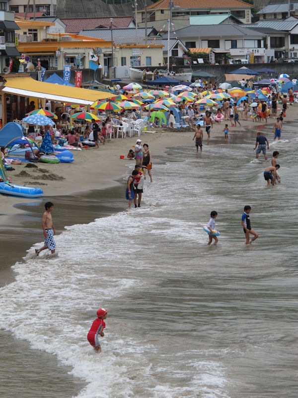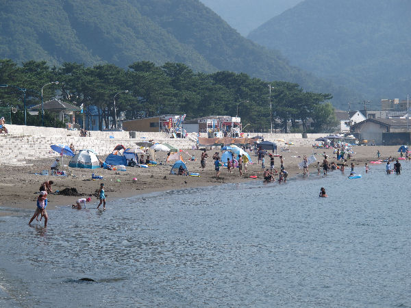 - 午前中まで曇りがちで風の強く吹く天気がつづきました。 午後になると日差しも出て海水浴日和となりました。 写真は、海水浴客でにぎわう今日の岩地海水浴場です。
