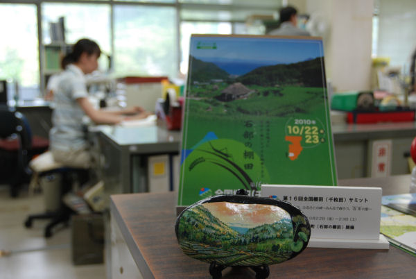 - 10月22日〜23日に行われる第16回全国棚田(千枚田)サミットをPRするために、役場や観光協会、商工会などのカウンターには棚田を描いたいずこいしが置かれています。