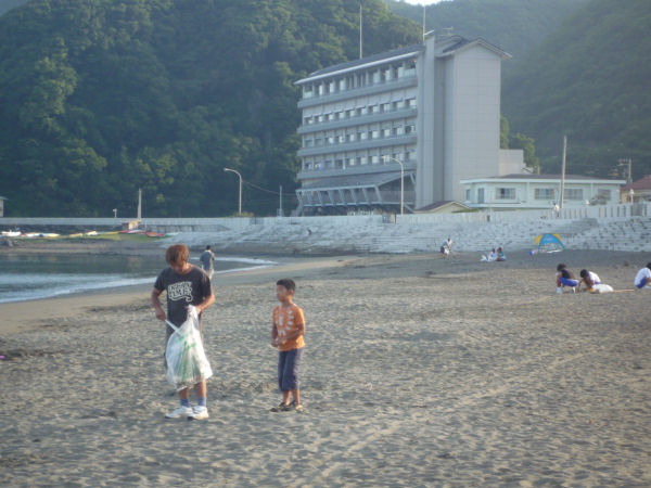 - 松崎海岸では、夏休み期間中小学生から大人まで毎朝10人ほどが参加し、海岸清掃が行われています。
