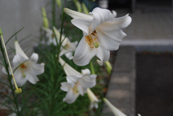 - 町内のさまざまな場所で高砂ユリがまっ白い花を咲かせています。