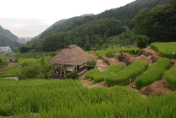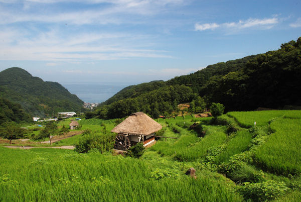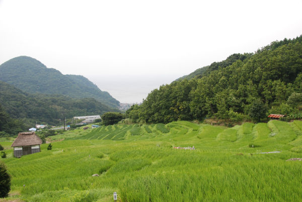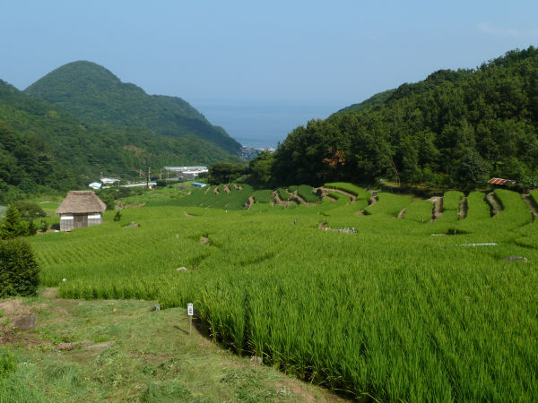 - 毎日、暑い日が続きますが、棚田の稲は順調に生育し、段々の緑の絨毯が広がっています。