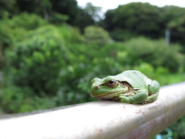 - 今日は朝からどんよりとした曇り空でした。 物干しざおの上にカエルが鎮座しています。