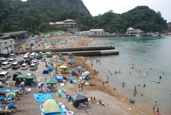 - 今日はあいにくの空模様でしたが、お盆に入り町内各海水浴場はお客様が訪れています。 中でも雲見海岸は、海水浴・沖の牛着岩周囲のダイビングなどで賑わっていました。
