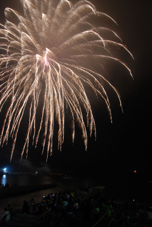 - 雲見、岩地海岸では、花火大会が開催されました。すぐ近くから打ち上げられる花火は迫力満点です。明日は松崎海岸で花火大会が開催されます。