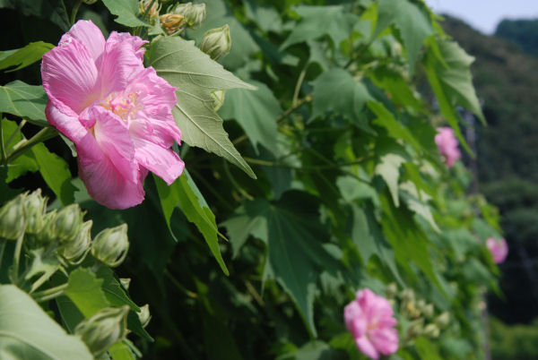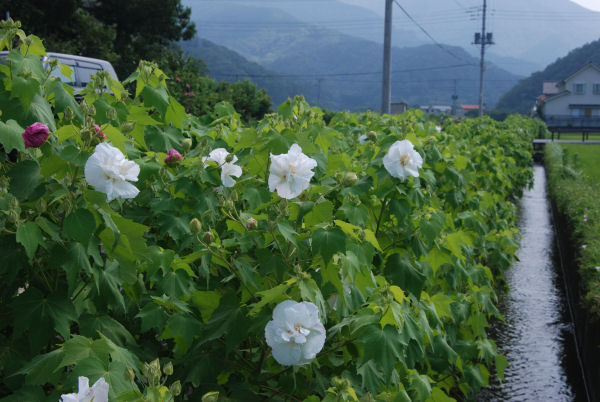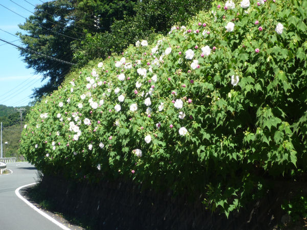 - 岩科の八木山地区では、酔芙蓉が咲き始めました。この花は朝白い花を咲かせ、日に当たっていると次第に酒に酔ったように赤色に変わる不思議な花です。