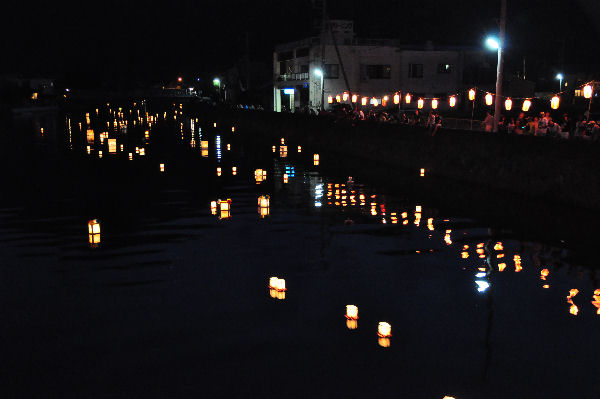 - 松崎海岸の花火の前には、那賀川で灯ろう流しが行われました。 約150の灯ろうが中瀬邸前から放流され、那賀川をゆるやかに流れて行きました。