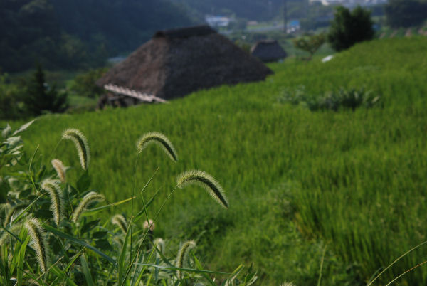 - 石部の棚田では、稲穂より一足先にアキノエノコログサがこうべを垂れ始めました。