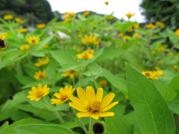 - 県道下田松崎線沿いにある小杉原地区内の老人会が管理している花壇では、黄花コスモスがきれいに咲き揃っています。