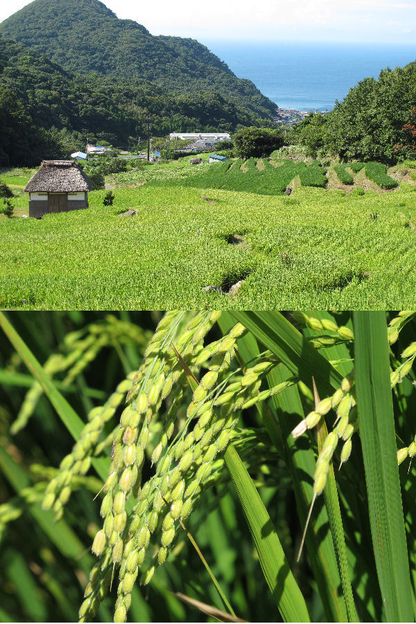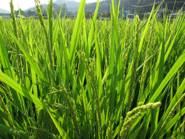 - 石部の棚田では、成長の早い稲は穂を付け始めました。