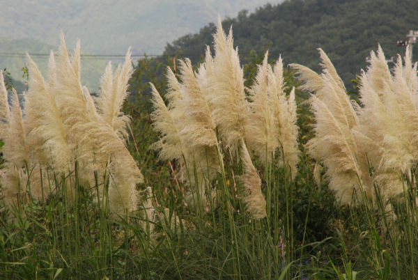 - パンパスグラスが約2メートルほどに成長し、先端に大きな白い穂を付けています。