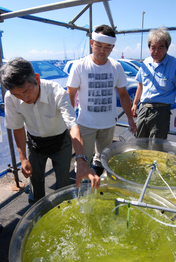 - 松崎花とロマンの里研究会では、松崎町特産の川のりの養殖実験を行っています。今日は、約10日間育てた川のりの成長状況を確認しました。