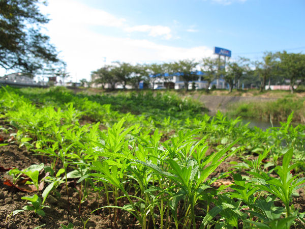 - 那賀川河川敷では、10月の棚田サミットに合せて巻いた黄花コスモスが芽を見せ始めました。