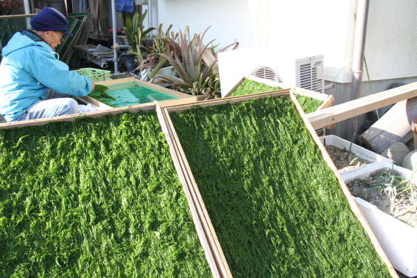 - 那賀川や岩科川の河口では、川のりが採れています。お昼過ぎには、家の軒先などで川のりを干す家庭が増えてきました。