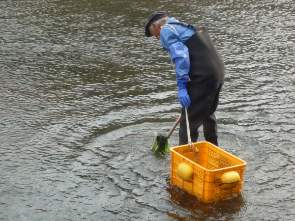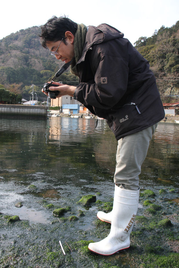 - 川のりの養殖実験を行っている花とロマンの里研究会では、スジアオノリ研究で高名な高知大学の平岡准教授を松崎にお招きし、松崎の川のりを採取していただきました。