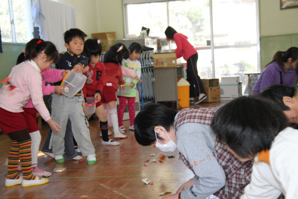 - 松崎幼稚園では、聖和保育園と合同で、ワークショップマナとの交流会が行われました。今回は、節分にちなみお互いを福の神に見立ててお菓子を播きあいました。