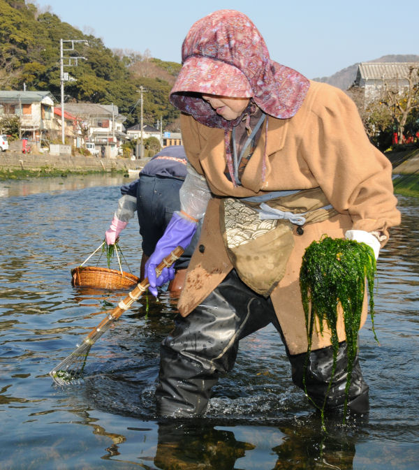- 那賀川と岩科川の河口では、川のり採りが最盛期を迎えています。干潮時には多くの人が川に入り30〜50センチに伸びた川のりを収穫していました。