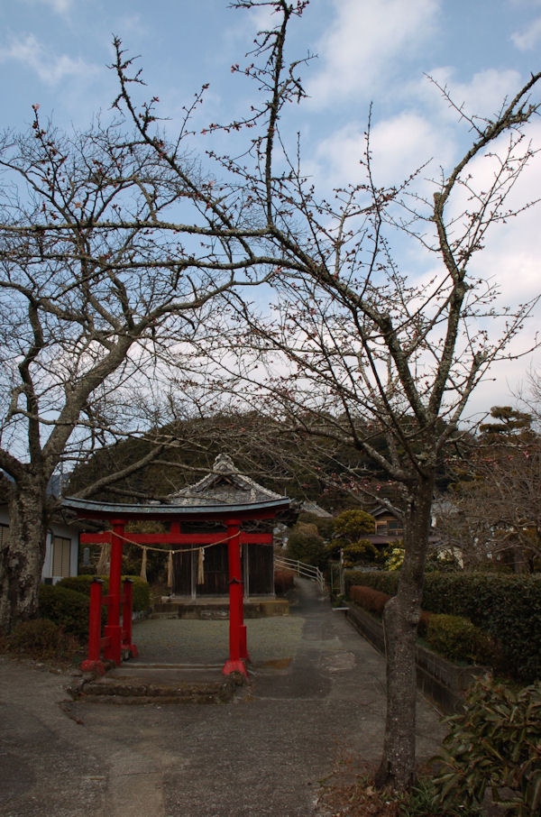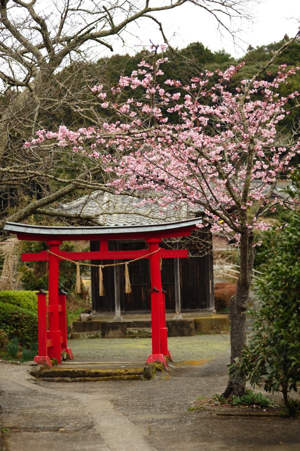 - 建久寺公民館前の鳥居の横で早咲きの桜が見ごろを迎えています。 小さな木ですが、薄いピンクの花をいっぱいに咲かせています。