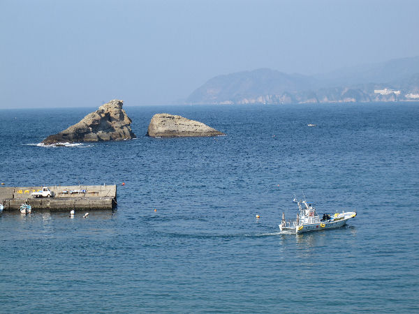 - 今日の雲見海岸です。 今日は霞がかかったような空模様で、富士山を望むことはできませんでした。 海は穏やかで、牛着岩周辺へとダイバーを運ぶ渡し船が何度も行きかっていました。