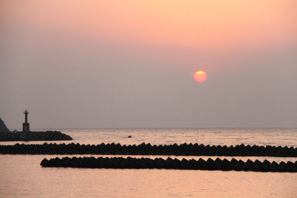 - 今日の松崎海岸からの夕日です。今日は雲が多く水平線に沈む夕日は見れませんでしたが、湾内の霞をオレンジに染め太陽が雲の中に沈んでいきました。