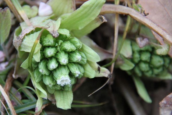 - 梅園の梅の木下には、大きく膨らみ、早くも花をつけたふきのとうが顔を出していました。
