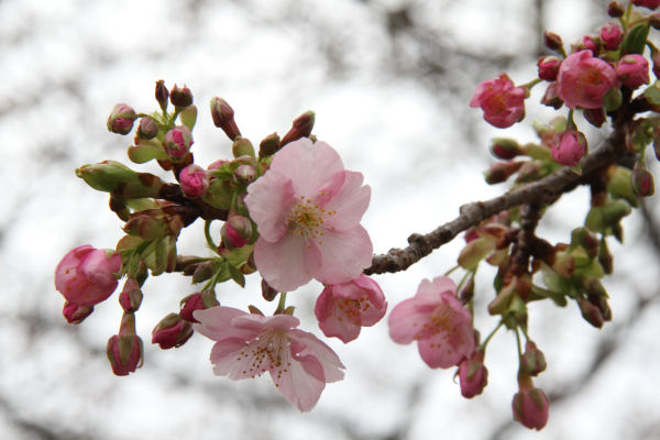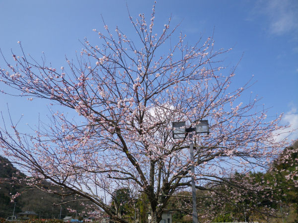 - 道の駅花の三聖苑内のかじかの湯横の桜がだいぶ花を付けてきました。この時季には珍しくソメイヨシノと同じような淡いピンク色をしています。