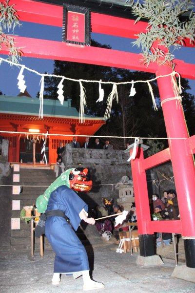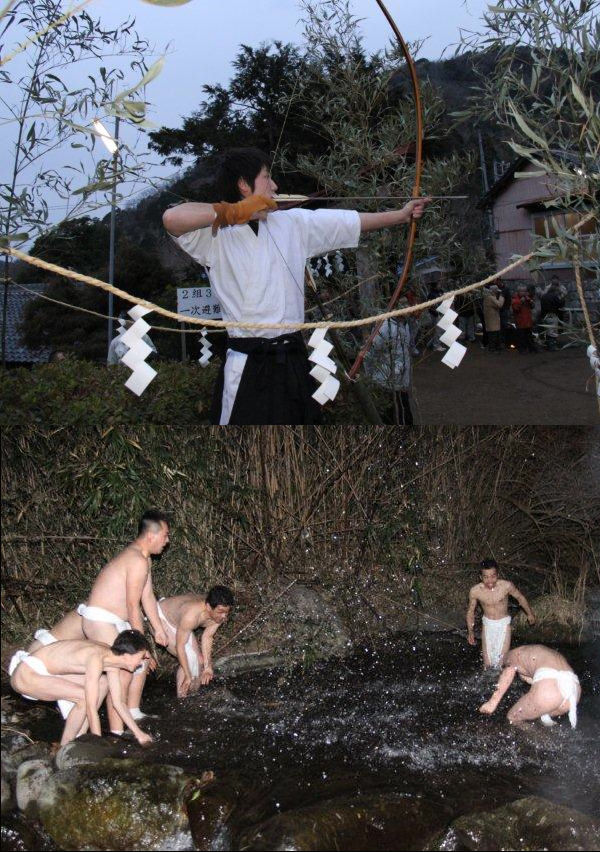 - 池代地区にある日吉神社では、鬼射まつりが行われました。 夜明け前に地区の若い衆がタイマツを片手に神社を出発し川に入り身を清めた後に、弓太郎と呼ばれる代表が的に矢が当たるまで弓を射る行事で、今年は22本目で命中しました。