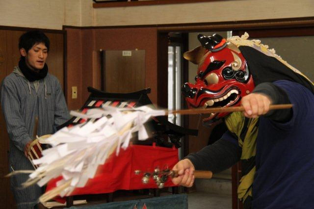- 今日は旧暦のお正月にあたることから桜田地区にある八幡神社では、神楽の奉納が行われました。 今年はあいにくの雨模様の天気となったため、神事終了後に会場を桜田公民館に移し神楽の奉納を行いました。