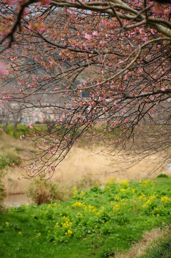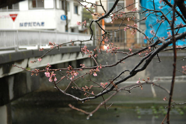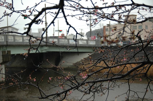 - 今年も新島橋上流の早咲きの桜が咲き始めました。 今日はあいにくの雨模様で、冷たい雨が咲き始めたピンクの花びらをたたいていました。
