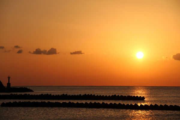 - 今日は朝まで雨の降る天気でしたが、一気に天気が回復し、夕方には松崎海岸から空を黄金色に染めて沈む夕日を見ることができました。