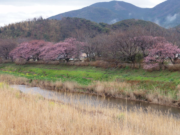 - 伏倉橋下流の土手では、早咲きの濃いピンク色をした桜が見ごろになってきました。もう少しすると短い区間ですが、桜のトンネルが出来そうです。