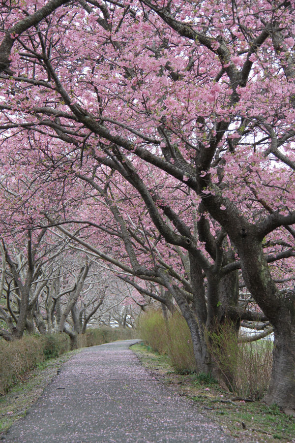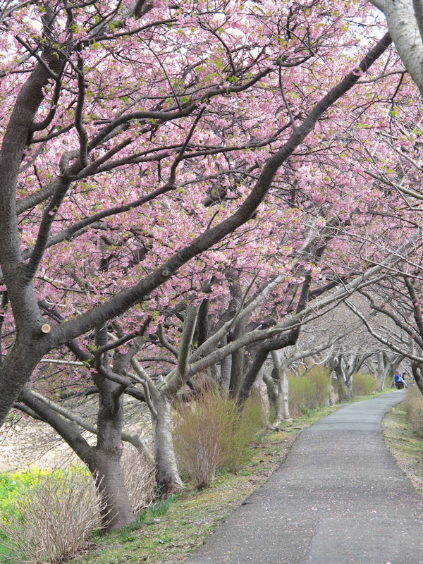 - 伏倉橋下流の土手では、昨日からの雨の影響からか早咲きのピンク色の桜が散り始め、歩道へ花びらが落ち、ピンクのカーペットが出来あがっていました。