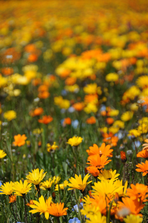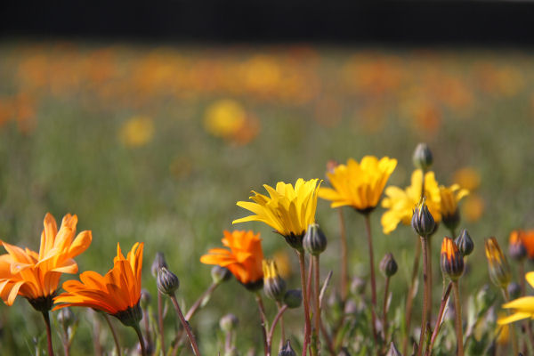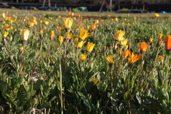 - 今日も昨日に引き続き暖かな日差しの一日となりました。 花畑のアフリカキンセンカも大きく開き、一面をオレンジ色に染めています。