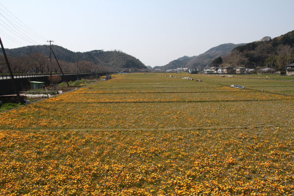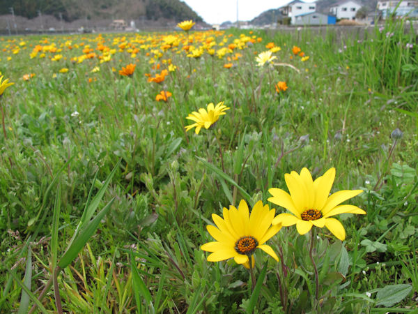 - 那賀地区の田んぼをつかった花畑では、晴天の影響からかアフリカキンセンカの開花が進みました。場所によってばらつきはありますが足湯と駐車場の間の田んぼでは3分咲き程度となりました。