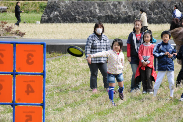 - 町営グラウンド付近の田んぼを会場に第3回親子スポーツフェスティバルが開催されました。参加した親子は、フリスビーを使った3種類の種目を協力し、楽しみながら競技しました。