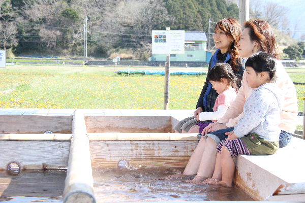 - 今日の花畑の開花状況と足湯の調整が整ったこともあり、明日から足湯をオープンします。この足湯は隣の源泉から毎分1,350リットル湧出している温泉を利用し、外気温で温度を調整する源泉かけ流しの足湯になります。
