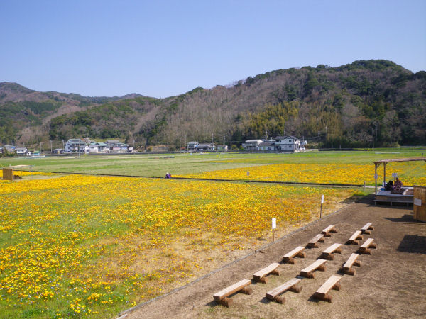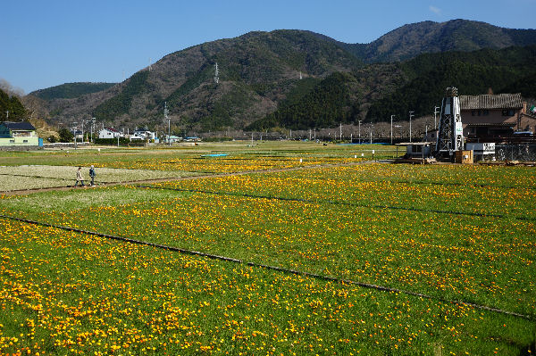 - 今日はひさしぶりに青空が広がる春らしい天候になりました。 田んぼをつかった花畑のアフリカキンセンカも元気に花開き、多くの行楽客が花見に訪れていました。