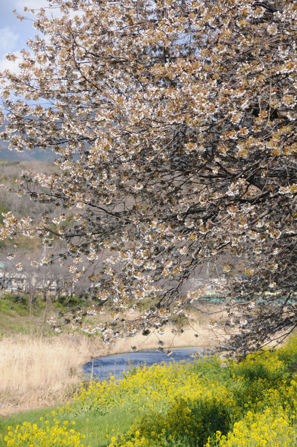 - 伏倉橋下流のヤマザクラが3〜5分咲きになってきました。土手の下に咲いている菜の花の黄色と桜の白とのコントラストがきれいです。