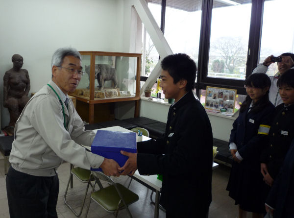 - 松崎中学校生徒会が役場を訪れ、東北地方太平洋沖地震の義援金174,431円を健康福祉課長へ手渡しました。また、本日開催した区長会では、区長会報酬を義援金とすることが決定しました。