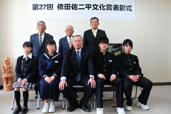- 役場応接室では、依田佐二平文化賞の表彰式が行われ、賀茂郡内の小・中学校から推薦をいただいた2個人、1団体が表彰されました。