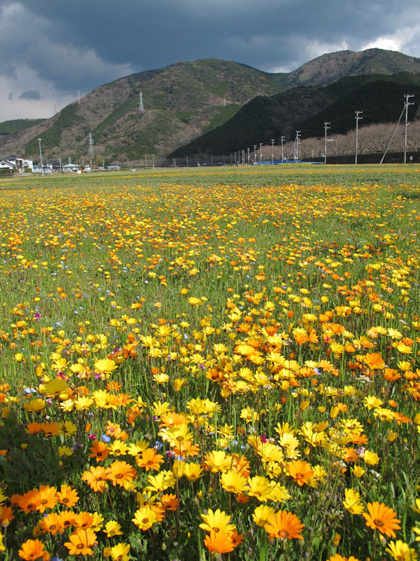 - 花畑も昨日からの暖かい気候を受け、だいぶ開花が進みました。足湯付近では、アフリカキンセンカが最盛期を迎え、比較的開花の遅い中川よりでもアフリカキンセンカが目立ってきました。