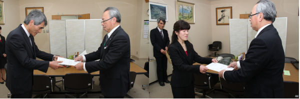 - 本日をもって退職される山本生活環境課山本和夫課長、クリーンピア松崎勤務渡辺重夫さん、教育委員会の鈴木智恵子さんへ辞令交付が行われました。
