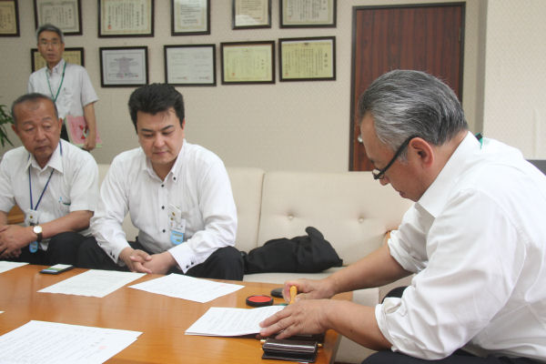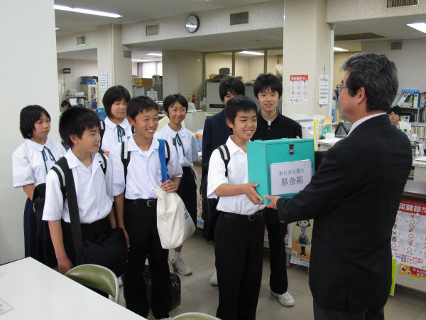 - 本日、松崎中学1年の学年委員会が、東日本大震災義捐金を町に届けてくれました。 校内で1年生を対象に活動を行い集められた義捐金は、日本赤十字社を通じて被災地に贈られます。