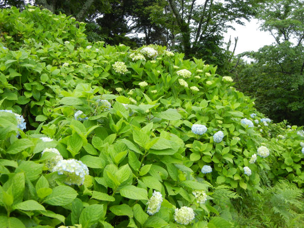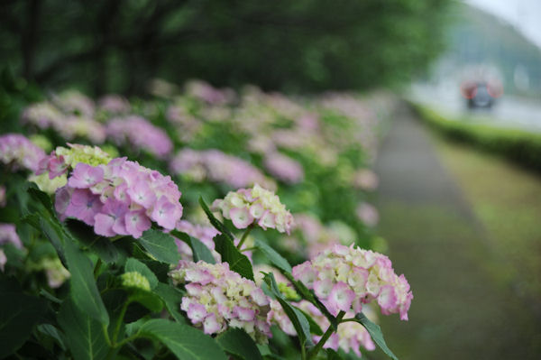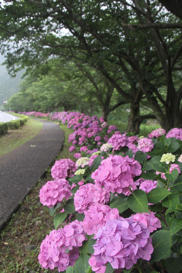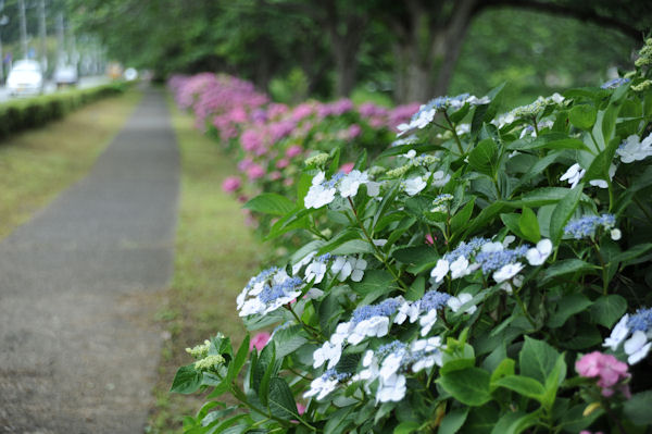 - 昨日までの雨は上がりましたが、曇りがちな一日となりました。 那賀バイパス桜並木の下では、アジサイがきれいに咲いています。