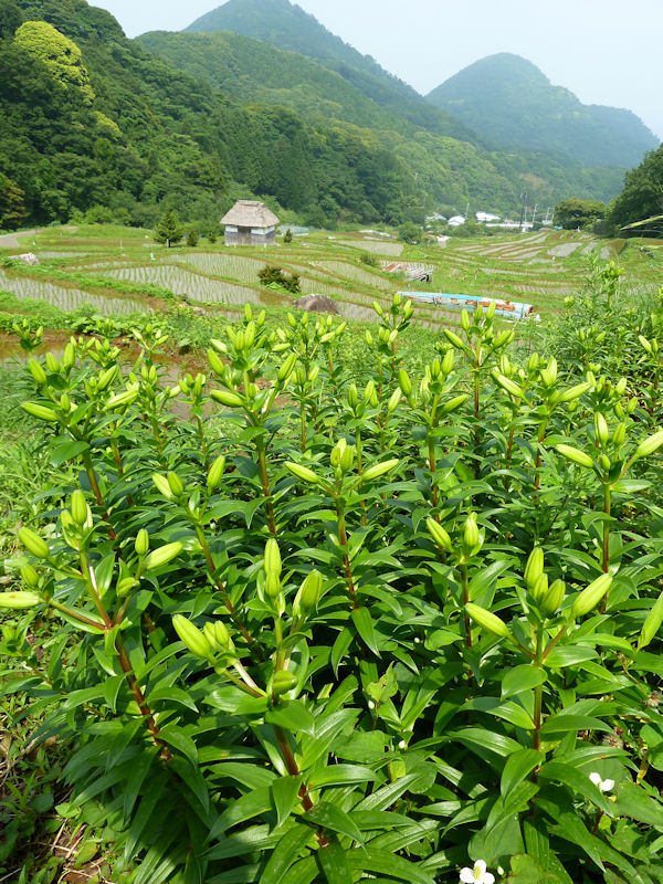 - 石部の棚田では、スカシユリが黄色い大きな花を咲かせはじめました。こちらももう少しすると見ごろを迎えそうです。