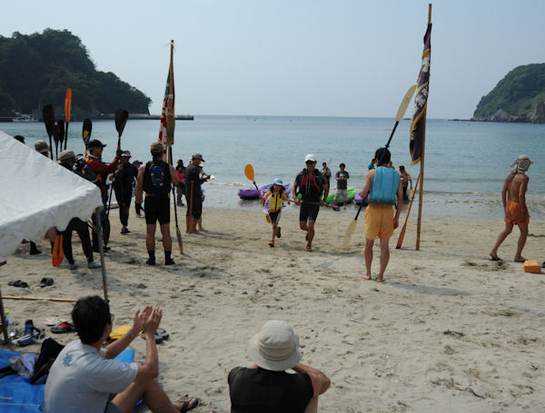 - 岩地海岸では、明日のシーカヤックマラソンの受付が始まりました。 受付後はプレイベントのミニレースが行われ、海岸は歓声に包まれています。