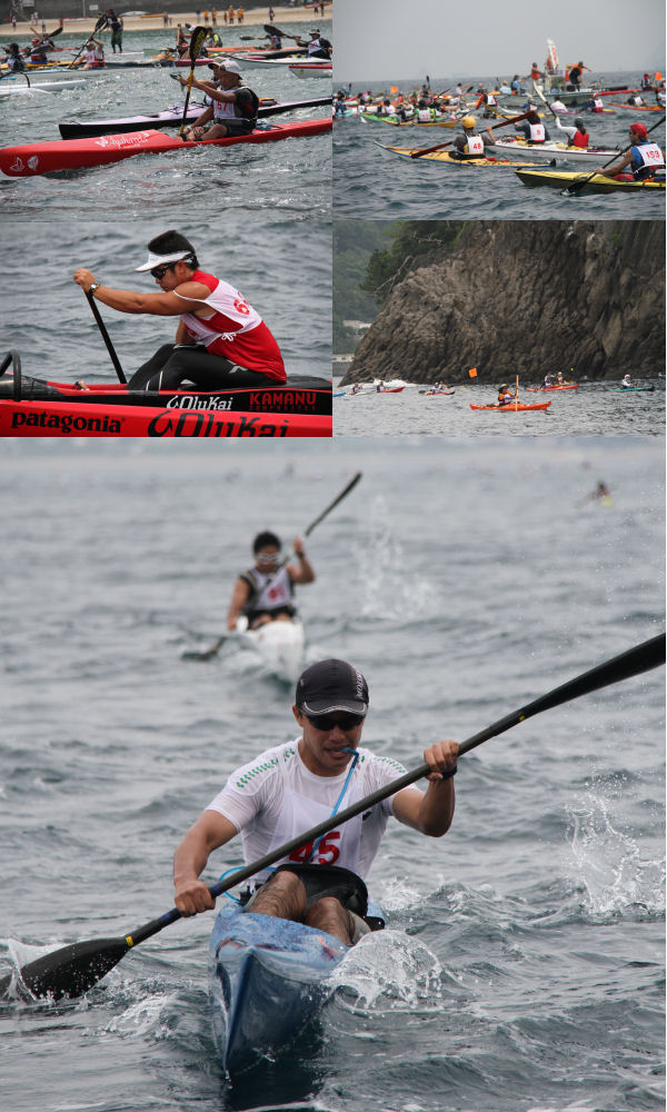 - 岩地海岸をスタート、ゴールする第13回伊豆松崎町シーカヤックマラソンが開催され、213艇、230人の選手が約14kmの変化に富んだ海岸線のコースを楽しみました。
