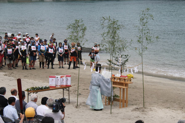 - 岩地海岸では、シーカヤックマラソンの開催に合わせて、これからの夏のシーズン中の海の安全を祈願する海上安全祈願式の神事が行われました。