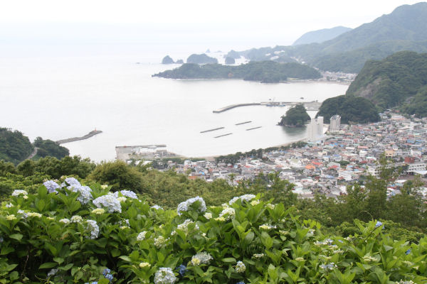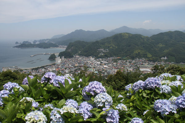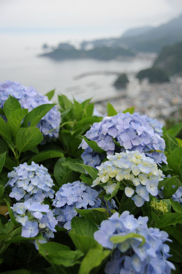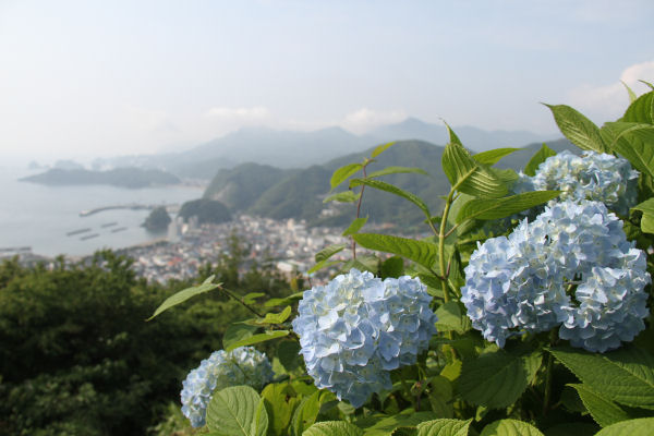 - 牛原山芝生の広場付近では、アジサイが青い花を咲きはじめました。アジサイの花と街並みを同時に眺められ、ドラマなどのロケ地としても知られています。