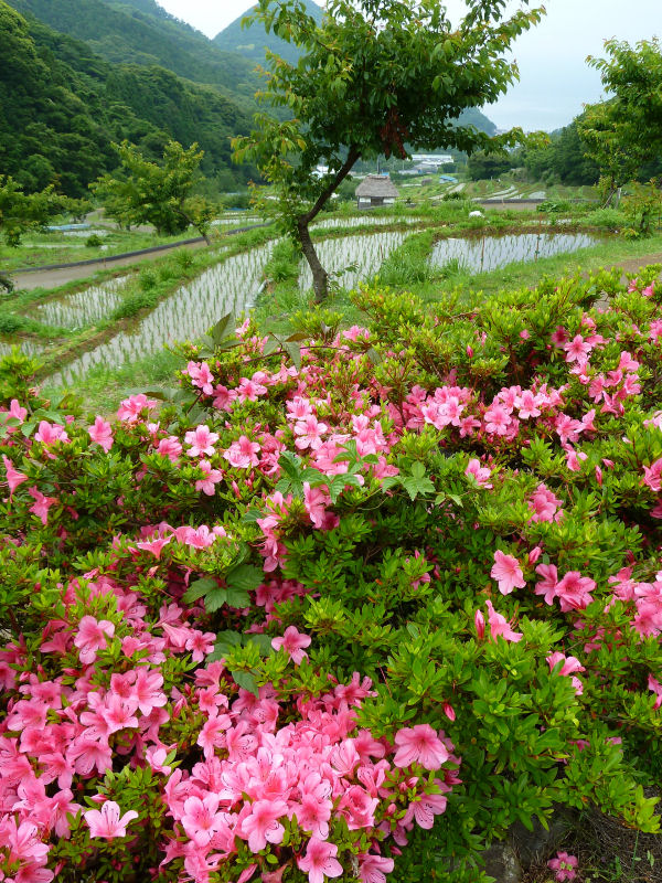 - 石部の棚田では、さつきが見ごろを迎えています。また、棚田以外の町内でもさまざまな場所の花壇などでもさつきが見ごろを迎えています。