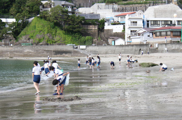 - 岩地地区に修学旅行生の第1陣が到着しました。到着した生徒は、これからいろいろな体験をさせていただく海の清掃作業を行いました。